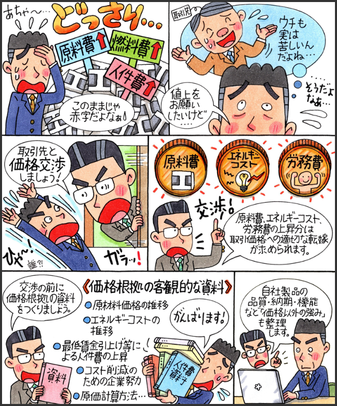 今回のマンガでわかるシリーズでは、売り手である「下請事業者」が、買い手である「親事業者」に、価格交渉を行うためのテクニックやポイントについてご紹介します。