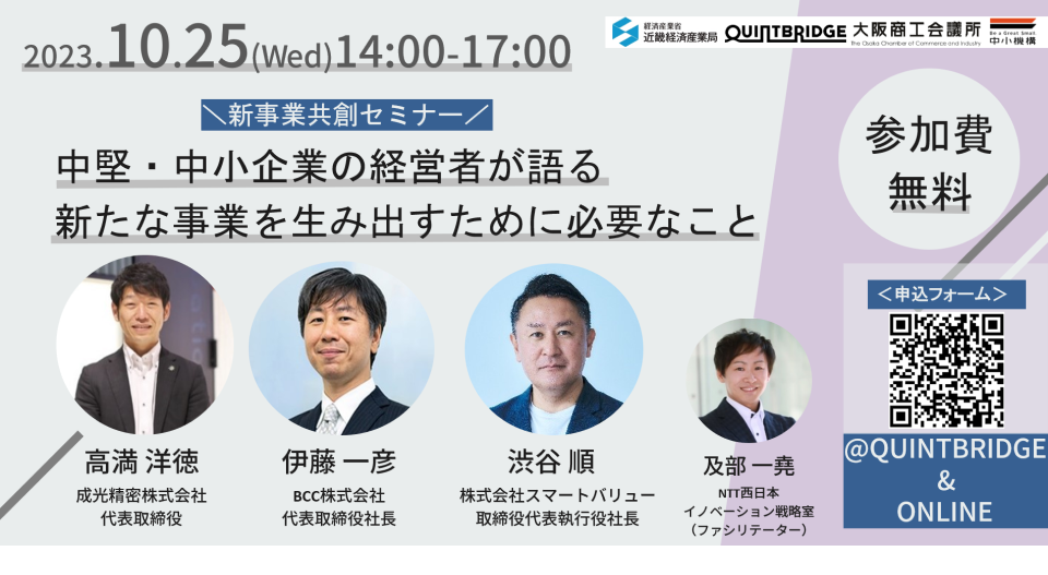 近畿経済産業局は10月25日、新事業共創セミナー「中堅・中小企業の経営者が語る新たな事業を生み出すために必要なこと」(中小機構近畿本部など共催)を大阪市都島区のQUINTBRIDGE(クイントブリッジ)で開催する。申し込み締め切りは10月23日。