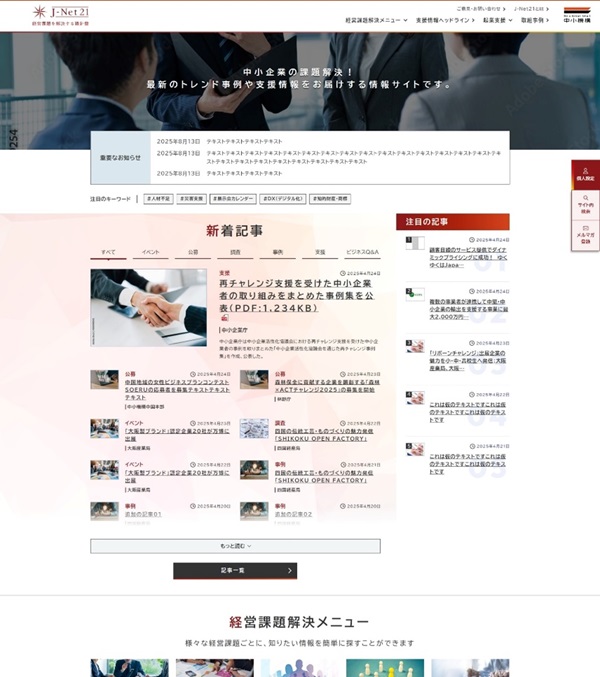 中小企業や支援機関の皆さまが、支援情報・補助金・事例などをこれまで以上に探しやすくなるよう、デザインを刷新し、検索機能やサイト内の導線を強化しました。必要な情報に素早くアクセスできる、新しいJ-Net21をぜひご活用ください。
