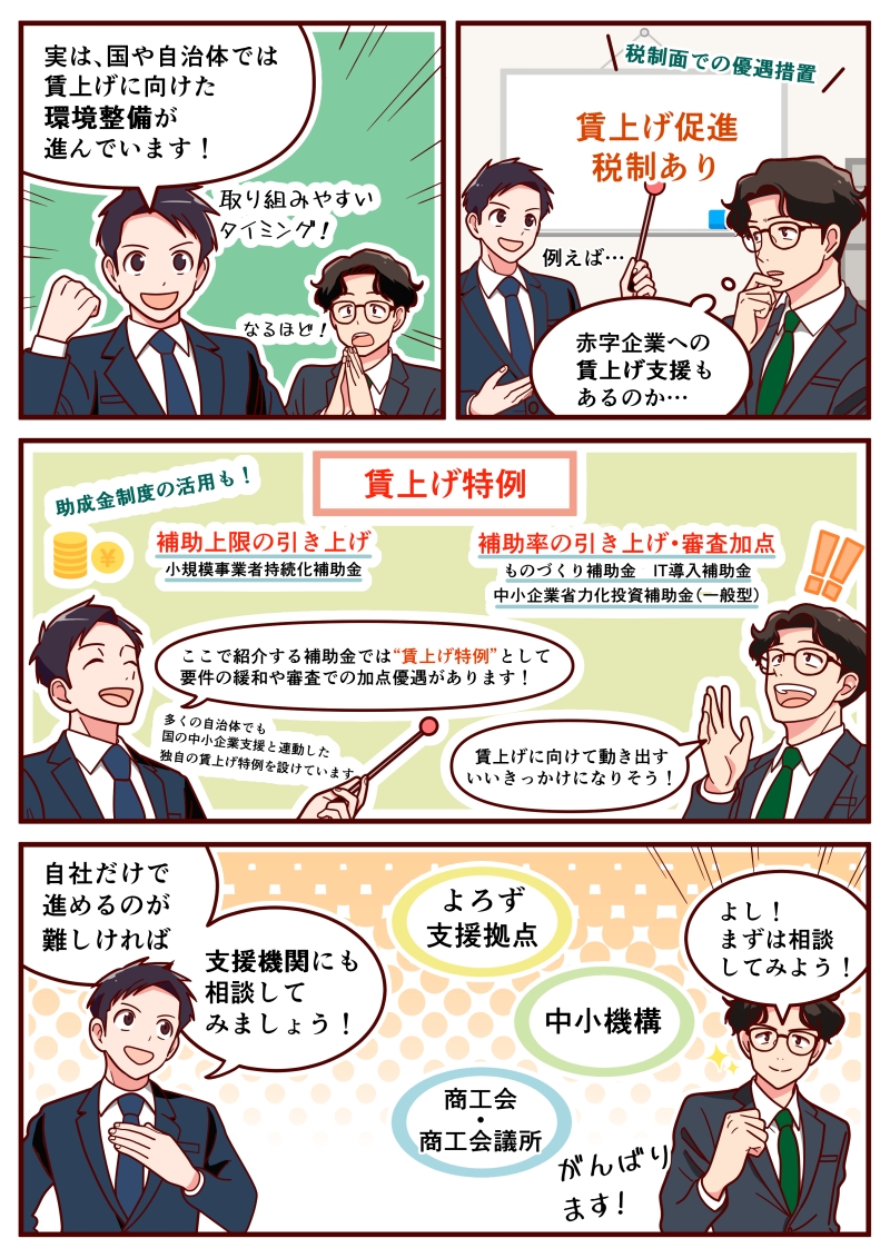 賃上げに向けた施策の実践や国の支援策の活用は、それなりの時間や手間を要するため、経営者が一人で抱え込むと大きな負担になります。前述のよろず支援拠点をはじめとする公的機関や金融機関、あるいは税理士のサポートを受けながら進めると良いでしょう。