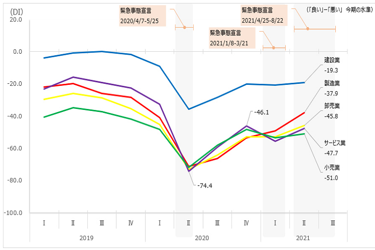 産業別の業況水準DIのコロナ禍での推移