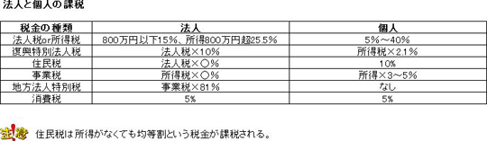 法人をつくる場合の税負担はどうなるのか?気になることだと思います。個人の稼ぎには所得税、住民税、事業税、規模によって消費税が課されます。一方、法人の稼ぎには法人税、法人住民税、法人事業税、規模によって消費税が課されます。個人も法人も基本的には同じような税金が課されます。