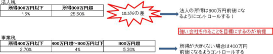 つまり、800万円までの税率15%と800万円を超えた場合の税率23.2%のギャップを利用できるわけです。800万円と800万円超では税率が8.2%も違ってくるため、法人の所得は毎年800万円前後になるようにコントロールすれば、効果的に法人税に対処可能となります。