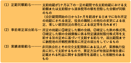 現行法においては、平成29年4月1日以後(新株予約権による給与は平成29年10月1日以後)に役員給与の支給に係る決議が行われる役員給与については、次に掲げる3つの給与について損金の額に算入することとされ、いずれにも該当しないものは損金の額に算入できないことになりました。