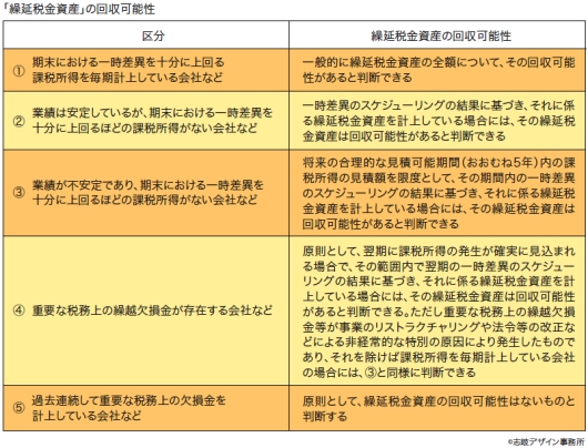繰延税金資産の計上については、以上の基準に基づいて判断することになります。
