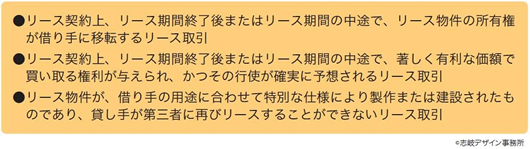 ファイナンス・リース取引とは、下記の要件を充たすリース取引のことをいいます。