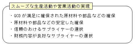 「スムーズな生産活動や営業活動の実現」とは、企業本来の活動である生産・営業活動に必要なQCDをもつモノやサービスをサプライヤーから仕入れ、必要とする場所にタイムリーに供給することです。具体的な目的は以下の通りです。