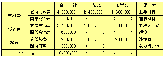 直接製造に携わった人の賃金は240万円、雑役係の人の賃金は60万円でした。直接製造に携わった人はA製品の製造に800時間、B製品の製造に400時間をかけていました。