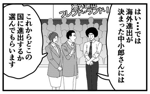 アフロは国内でも大人気なので海外でも大丈夫だろうと、自慢の商品を手に勝負するという。とあるテストマーケティングの機会にその商品のサンプルを配布しながら広告したのだが、サンプル配布を手伝っていただぶぴーが海外バイヤーの注目を集めてしまい、本来の商品とアフロは見向きもされなくなってしまうのだった…。このように海外ではよく思わぬものが人気になることがあります。