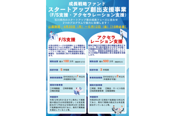 石川県は、革新的な技術やビジネスモデルで世界に新しい価値を生み出しながら急成長を図るスタートアップの創出を促すことを目的に、事業化や販路開拓を支援するスタートアップ創出事業の公募を始めた。