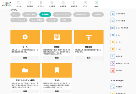 導入直後から使える基本機能はどのサービスも控えめですが、ECサイトに求められるあらゆるニーズに応えるため、運営会社自身や第三者がECサイトの機能を追加する多数の「アプリ」を配布している点に注目したいところです。例えばデジタルコンテンツの販売、メールマガジンの配信、ユーザーレビューの機能などはこの「アプリ」の追加によって実現します。