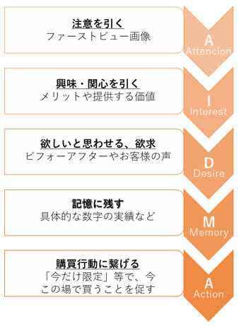 基本的なランディングページの構成要素は、マーケティングでも定番のAIDMA(アイドマ)で考えることができます。購買に繋がるように、閲覧者をもてなし、価値を感じてもらって、誘導するような構成になっています。