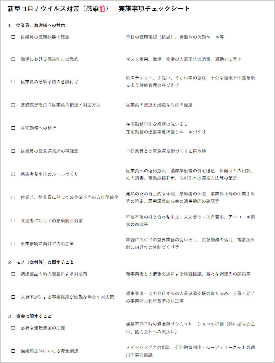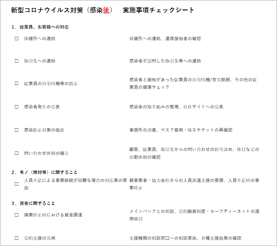 以下にあるような感染前・感染後の実施事項チェックシートを参照にしながら、従業員・お客様への対応、モノ(商材等)に関すること、資金に関することにつき、それぞれ準備を進めましょう。