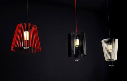 洋傘の素材を用い、和傘の骨組みの意匠を見せる可動式照明器具「MOTO」